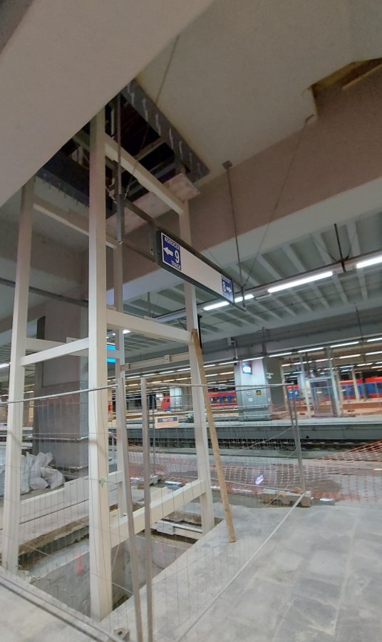 Na slici se vidi da je čelično okno na ploči došlo skoro do samih greda tako da je konstrukcija ograničenih dimenzija, povećanje na drugu stranu takođe nije moguće zbog širine prostora izmedju okna i silaza stepenicama i travelatorima. Ostavljeno je dovoljno prostora za bezbedan manevar kolicima pri izlasku iz lifta. Vrata u ovom slučaju mogu biti postavljena samo na istom ili suprotnom pravcu kabine, bočni otvor zahteva drugačije dimenzije, čini mi se da je minimalna širina vrata 150cm, dok u ovom slučaju otvori mogu biti min 90cm.Glupost je što se iz lifta na peronu izlazi ka koloseku, umesto na sredinu perona, a taman lepo ima nasta da se prođe između stubova. Arhitekta ovde mozak uključio nije...