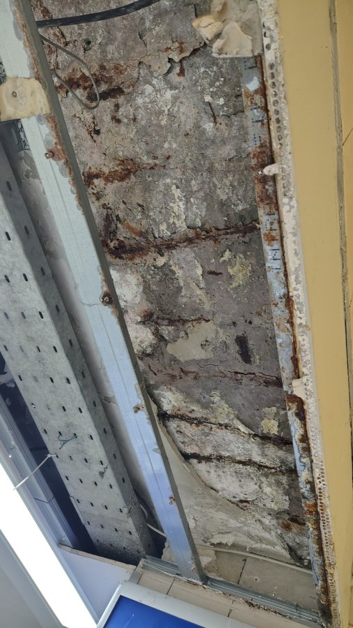 Ovako slično izgleda i armatura iznad ulaza u polikliniku u Kliničkom centru Vojvodine u NS, tj. ulaza u onaj ukopani deo gde se ide za ortopediju.Dok dočekamo 1 i 2, možda ostanemo bez 9 i 10... Slike su od par nedelja, postoje strukturna oštećenja, zarđala je armatura u gredama, a deluje da se raširila i dovela do pucanja betona ili ranijeg krpljenja: