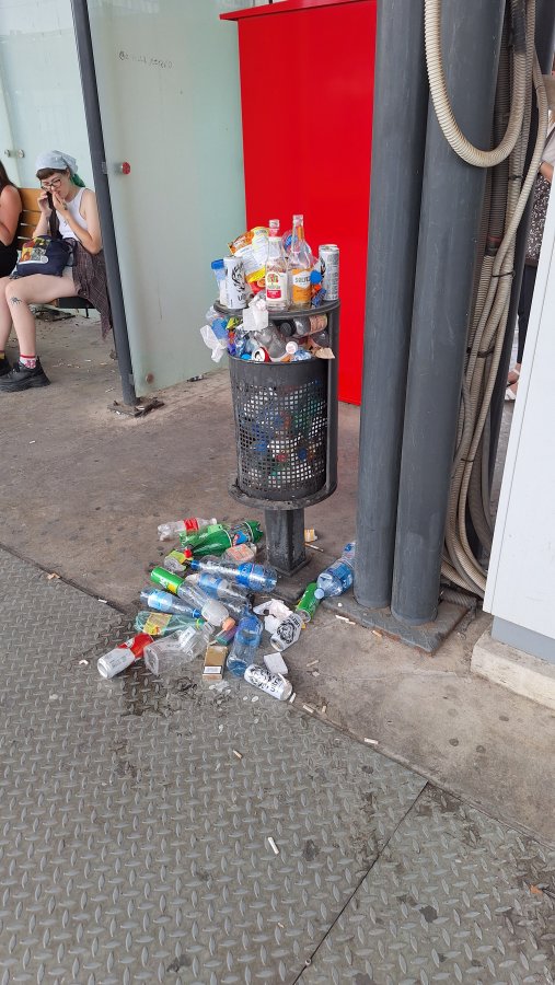 Нисам хтео више да фотографишем, али све корпе са ове стране перона су пуне. Исто је и на перону уз 4. и 5. колосек. Како ветар дува, све то разноси около. По перону свуда опушци (ту су криви и путници).