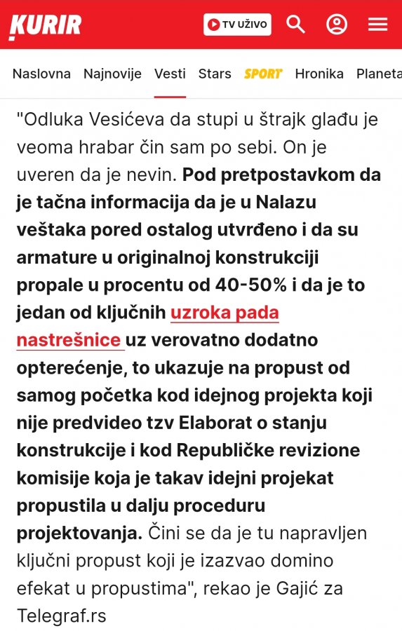 Što u svakom slučaju ne menja odgovornost, odnosno i dalje za to postoje odgovorna lica koja su morala to utvrditi. Samo da neko od njih progovori, jer je meni potpuno nemoguće da u tom lancu odgovornosti, i kroz koliko ruka prolazi elaborat, da niko nije video toliko propadanje armature i da nije pomislio da je to opasno. Onda ili nije provereno, ili nisu smatrali da je opasno ili neko drugi nije smatrao da nije opasno pa su ovi morali da potpišu.