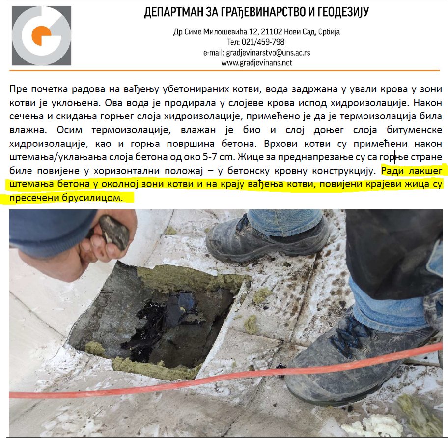 Opet baljezganja i lupetanja i senzacionalizam. Covek je citirao deo izvestaja u kome pise da su presece sajle prilikom vadjenja sidrista za vestacenje, smuljao nesto oko hidroizolacije i rekao kako su oni tad kad su radili izolaciju isekli brusilicom zatege i zato je palo . Jos prica kako nema korozije, a u izvestaju pise kako 40 sajli nije nosilo nista od korozije. Jezivo ko sve uzima medijski prostor i sebe zove strucnjakom.