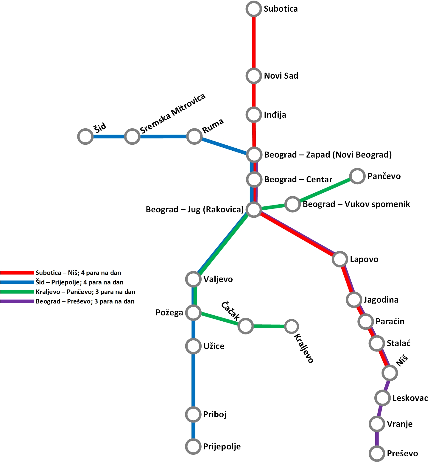 плус Интер-сити Србија линије, с краја на крај државе (у загради је број гарнитура по линији):