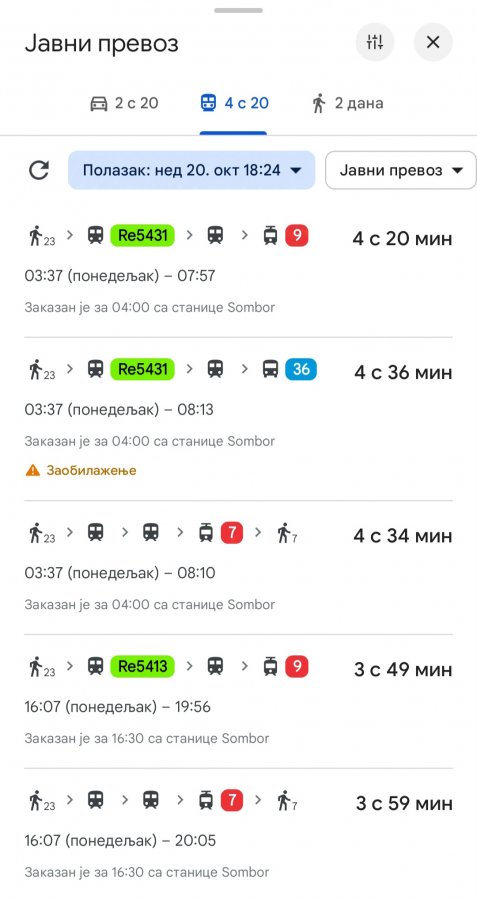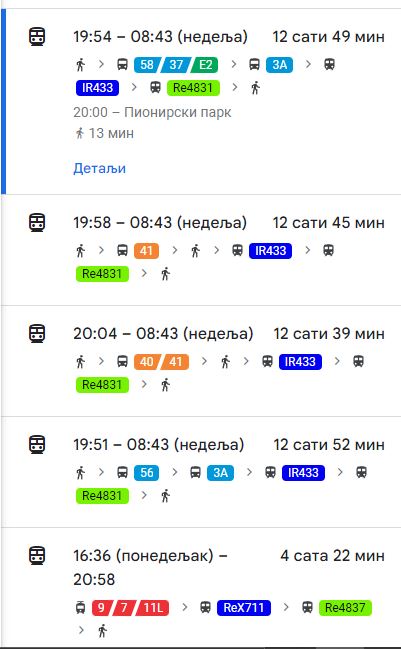ja samo hocu vidim ove sto ne znaju srb voz aplikacije da koriste da slepo veruju ovim greskamaПрема Гуглу стигао бих за експресних нешто мало јаче од 4 сата с тим да бих морао да устанем у 3 сата или да чекам до 16.