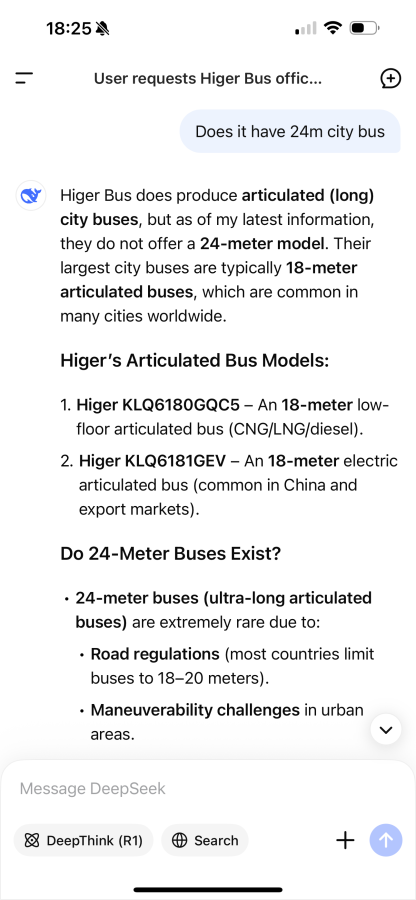 Ne racunaj ozbiljno na njihov sajt jer tu ima jako malo informacija. Ma da možda i ne bude Higer, nego je to neko samo nagađao, možda zapravo bude i za Gsp Yutong ili BYD, kao što je @Toma rekao. Ipak je period 2 godine i za to vreme bilo ko može da napravi elektrobuse.Ja sam tražio i po njihovom kineskom sajtu nema nigde modela većeg od 18m. Evo šta kaže njihov DeepSeek. Pogledajte prilog 243380