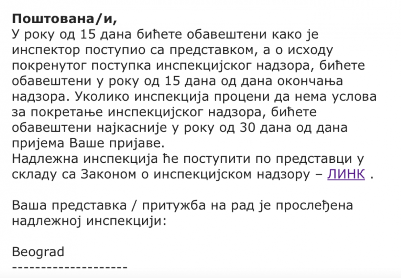 Све си одговорио у првој реченици.Da li neko moze da mi objasni (razjasni) da li ovo smisljeno da se osoba koja prijavi nelegalnu gradnju sludi i odustane od daljeg insistiranja, ili sam ja nesto pobrkao? Prijavio sam nelegalnu gradnju na K. vencu 15.10.24 i dobio odgovor da cu u roku od 15 dana biti obavesten kako je inspektor postupio sa prijavom, a najdalje u roku od 30 dana primanja prijave dobiti konacan odgovora od inspektora sta je sa slucajem. Niko nista ne obavestava i posle nekoliko intervencija sa pitanjem gde je odgovor, 15.11.24 dobijem odgovor da Kontakt centar republickih inspekcija nije nadlezan da da odgovor, nego inspektor koji ce me obavestiti kada se zavrsi postupak (bez datumskog ogranicenja). Za to vreme, svaki investitor moze da sagradi soliter, koji ce posle. naravno, legalizovati, jer je inspekcija nije reagovala na vreme vec je zetkla zavrsen objekat. Da li neko ima iskustvo sa prijavljivanjem ili je ovo vec proveren nacin kako se gradi bez odgovornosti. Znaci pricamo Kosancicevom vencu, u centru grada u zasticenoj zoni!!!, a ne o nekom objektu na periferiji (sto svakako ne umanjuje ovaj problem koji bi trebao da se odnosi na sve!!!.