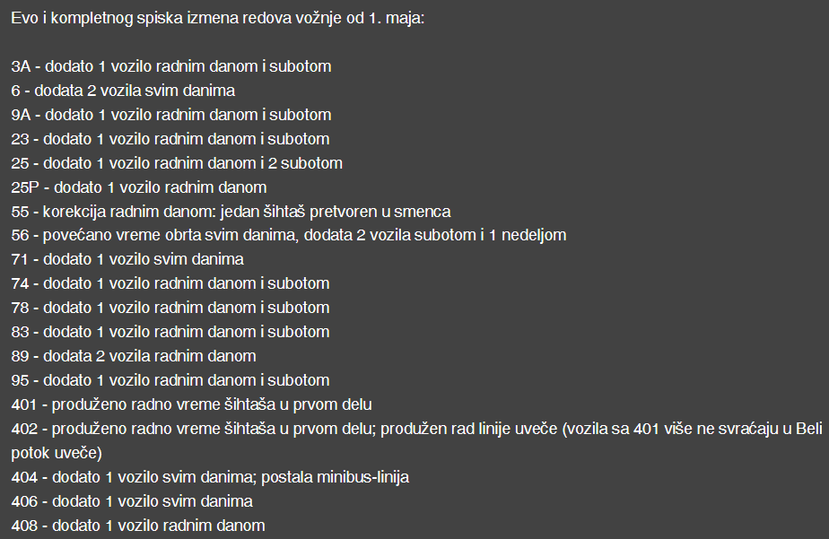Mislio sam na tabelarni pregled ili nešto poput ovoga što je ovde postavljeno u vezi izmena redova vožnje od 01.05. Pretpostavljam da isti izvor koji je poslao informaciju za pojačanje određenih linija ima i ukupan broj vozila za svaku.