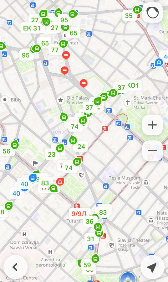 Ako Sekretarijat još nije izmenio trasu u svom GTFS feedu, prikazivaće se ovako. Isto kao i na Google Maps. Feeduje se vreme, pa aplikacija koja "čita" taj feed prikazuje pretpostavljenu poziciju.Nešto je meni sumnjiv taj Yandex, otkud 27 u Mije Kovačevića, kad je KT na Bogosloviji zatvoren?