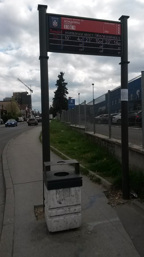 Čini mi se da je u pitanju stajalište VMA u smeru ka gradu, kompletan displej na stubovima, prikazivao je tekst roze / ljubičaste boje. Otkazala jedna od boja RGB sistema.​