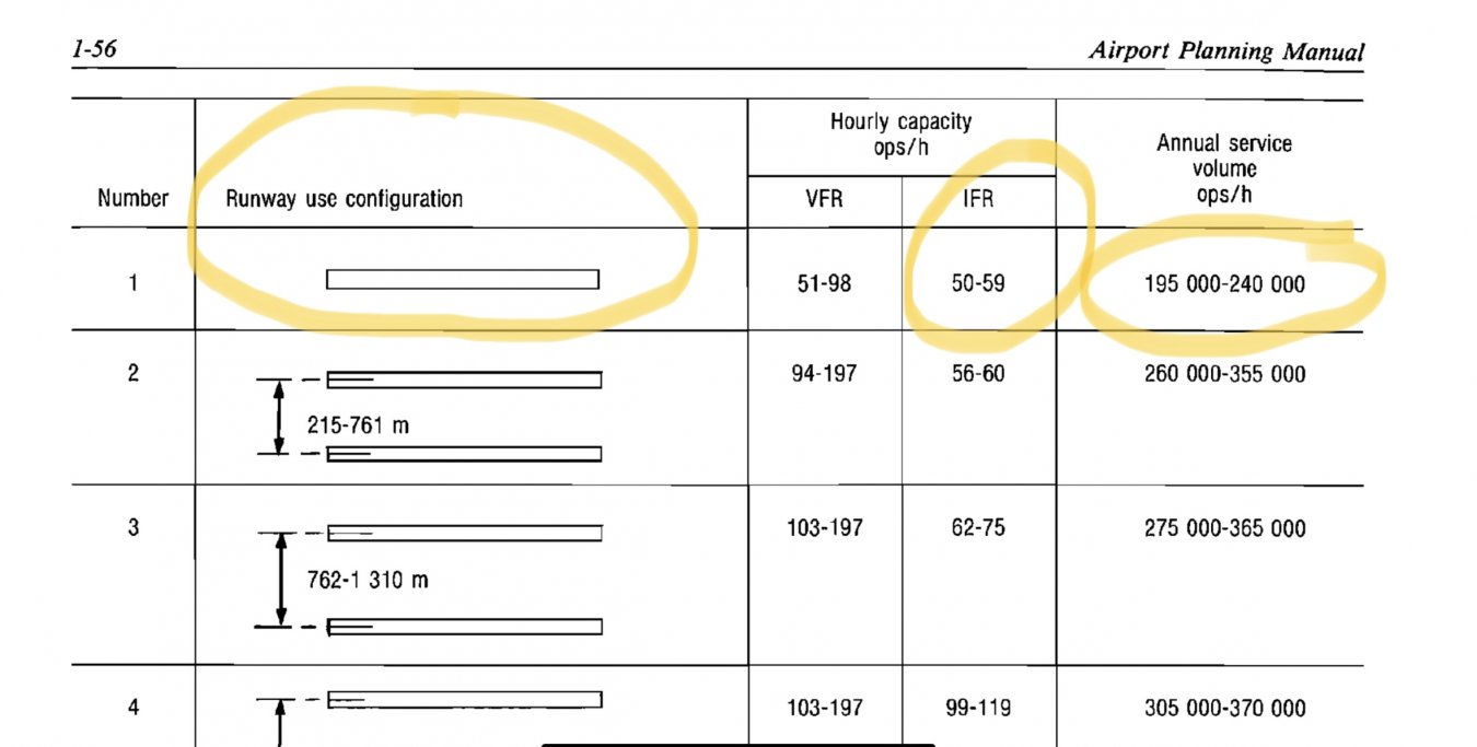 So?@Пантограф , да ли си озбиљан? Да се манемо међународно потврђених методологија, и да одлуку о конфигурацији аеродрома донесемо на основу коментара са интернет портала? Ево табеле која у САД служи као оријентација за број писта у односу на број операција: