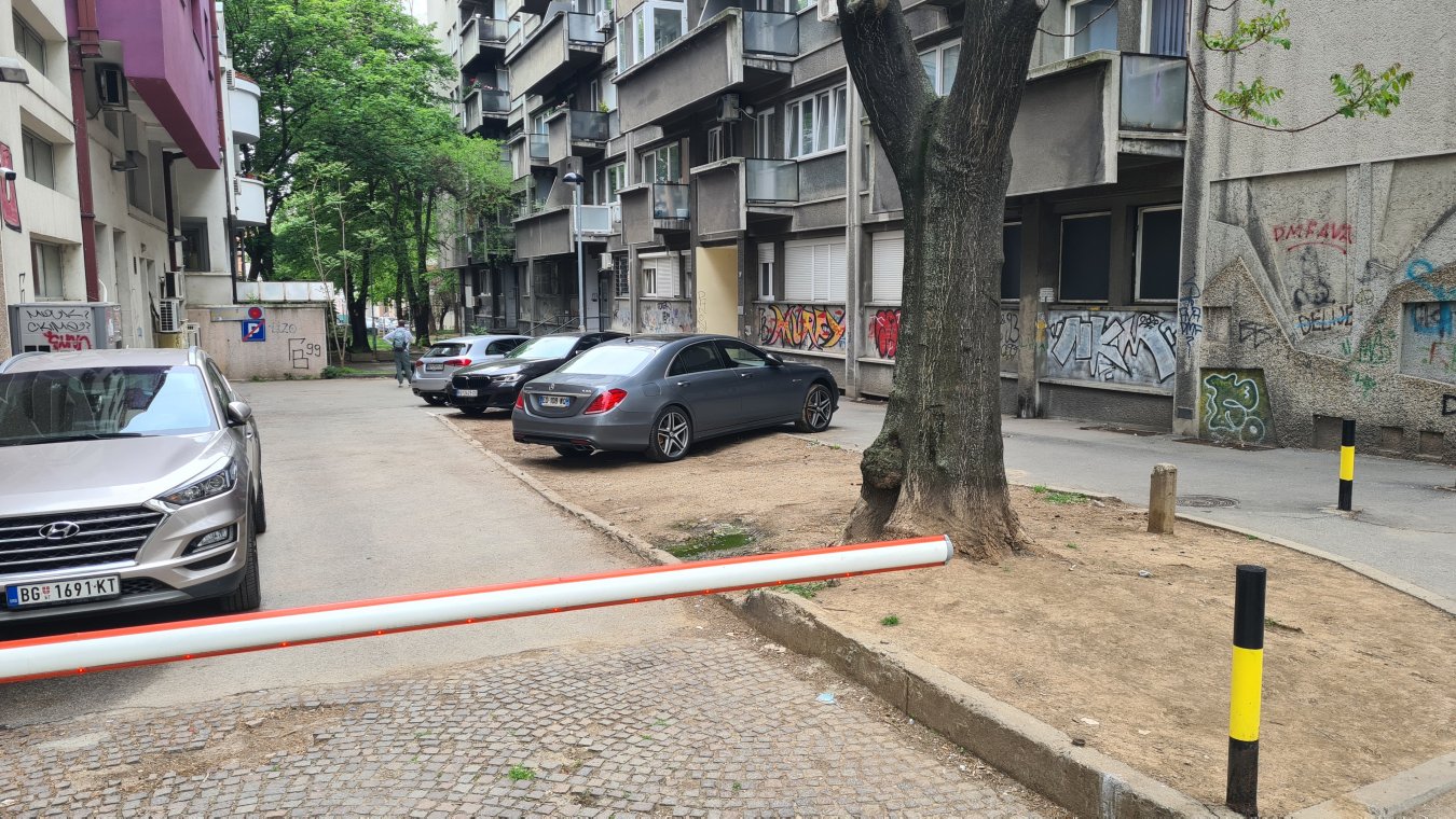 Postoji neka rampa koja "čuva" ulaz u garažu ali se opušteno parkira na tom prilazu garaži pa onda verovatno da ne smetaju-staju na travu (koje nema više ni u tragovima).