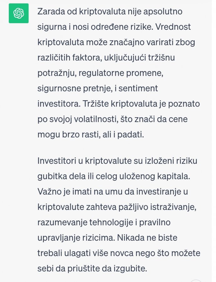Pa tako ti je i sa svim drugim investicijama. Ako propadne onda jbg, nisi imao sreće. Evo beki tj chatgpt je dao suštinsko objašnjenje.