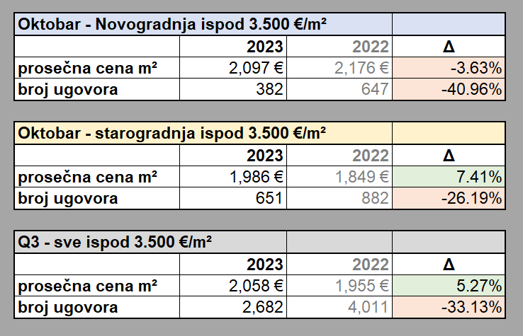 • Prosečna cena za Q3 je veća, a promet je manji za oko trećinu - ovo kvartalno poređenje sam uradio jer je jasniji trend u odnosu na jedan mesec - dakle cena je opet skočila u odnosu na prošlu godinu (zbog skoka cene starogradnje).