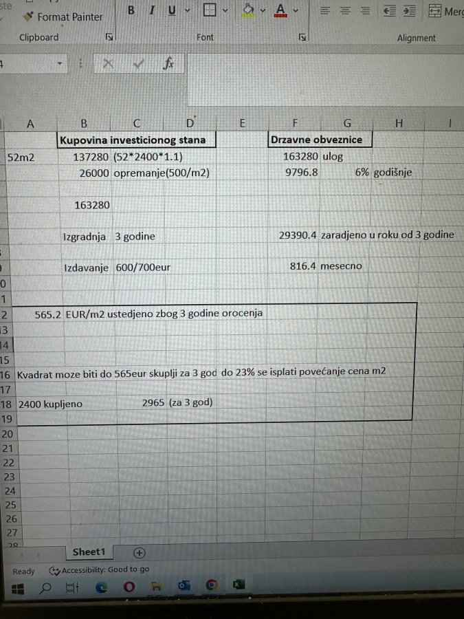 Evo po meni jedne računice za kupovinu Investicionog stana/stana u izgradnji ili za ulaganje tih novaca u kupovinu drzavnih obveznica.
