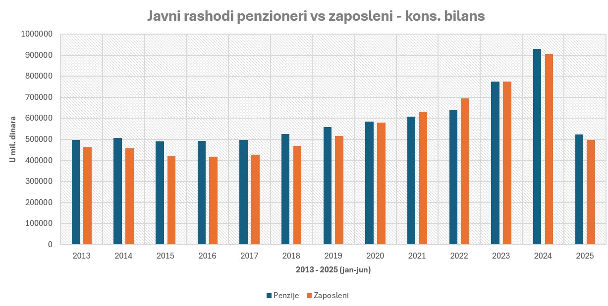 PLus sad ovo povećanje minimalca što znači i javni sektor. Ako uzmemo veoma tačnu odokativnu lupljenje metodu da ima 100k ćaci džabalebaroša po javnim ustanovama to je 100k x 1200e (bruto) = 120M plus dodamo onaj manjak od nekoliko miliona u zdravstvu = eto povećanje plata za zdravstvo ali tu se benefit ne završava. Skidamo 100k džabalebaroša sa sise, ne trebaju nam migranti i zaposle se regularno kod privatnika nakon čega se regularno isplaćuje plata i porez tako da je država na dobitku za dodatni porez.Baš su mi danas zapale za oko penzije kad sam prelistavao novi "Bilten javnih finansija". Od 2021-2022 su rashodi za penzije krenuli da skaču izrazito: sa 608,693.8 miliona rsd, na 929,618.8 na kraju 2024. Ove godine će rashodi biti još veći. Vlast je možda i malko suviše posrljala u populistički diskurs, te će sad biti ljute borbe sa inflacijom (a poprilično pedantno pratim i ove nove mere oko ograničenja cena, i ne deluje mi baš sjajno).