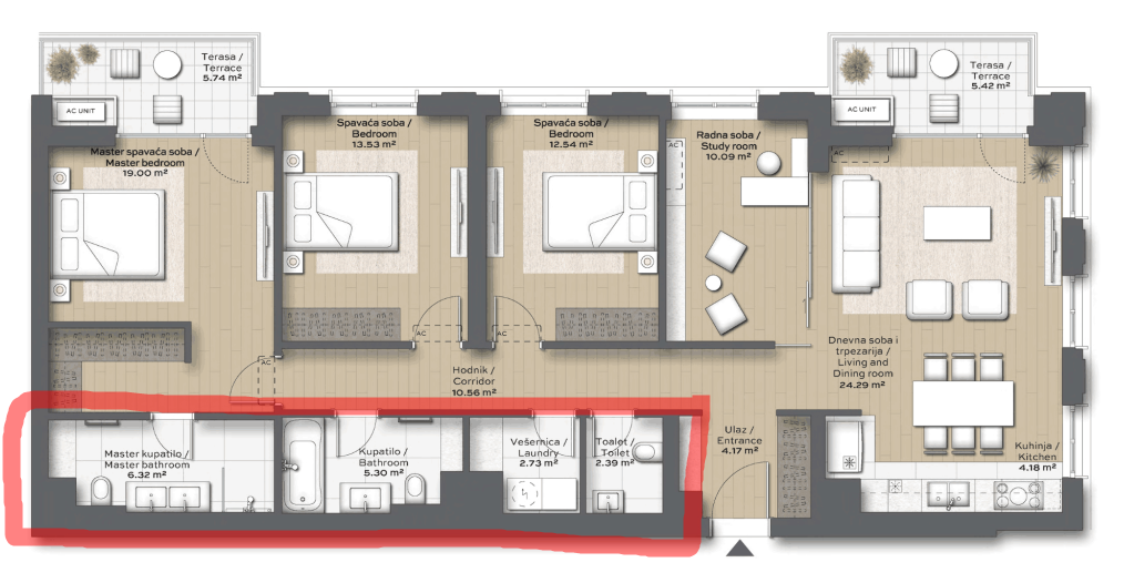 Jedno veće master kupatilo (bar 10 kvadrata) koje koriste svi, jedno malo kupatilce sa tuš kabinom i wc šoljom tipa 4 kvadrata ako je nekome baš stalo da se tušira ili ide u WC dok je glavno kupatilo zauzeto i to je to što ti treba od sanitarnog bloka. Umesto ovolikog voza gde em nemaš nijedno kršteno kupatilo, em imaš gomilu WC šolja, svedeš na dva kupatila i dobiješ prostor za vrlo solidnu ostavu/špajz za sve živo što ti treba (a takvog prostora uvek treba u kući). Isto tako ova radna soba je malo neprikladna, imaš stan od 130 kvadrata i prč od dnevnog boravka/trpezarije/kuhinje od 30 kvadrata, ne ide. Tu radnu sobu treba izbaciti (ili žrtvovati jedan garderober i tamo napraviti).