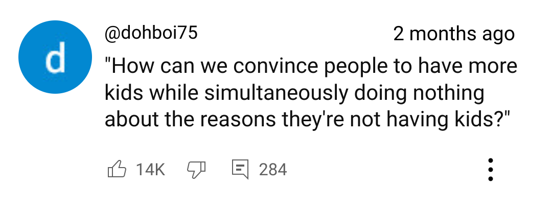 U zadnje vreme sam gledao i čitao nekolicinu videa i članaka na ovu temu opadajućeg nataliteta širom sveta, i lupetanja i kuknjave vlasti, država i kompanija zbog toga. Komentari su naravno razni ali oni na okoje sam najčešće naletao, i koji bi imali najviše pluseva i deljenja bi glasili otprilike "Vukovi se bune što se ovce sve manje množe".