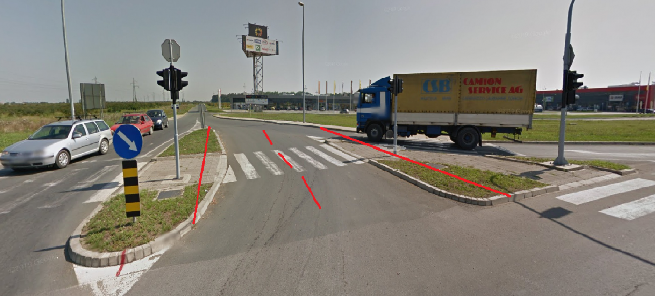 Tvoj predlog je dobar, ali se ponovo vraćamo na onu činjenicu da će ova raskrsnica biti preopterećena sve dok se ne završi MP od Loznice. Naravno, ukoliko se gradske vlasti dosete da bi ovako nešto moglo da se uradi, što me iskreno čudi, biće pun pogodak.Гледајући снимак раскрснице, оно што би се могло урадити за смер Лозница - Рума је да се улазна рампа на западну трансверзалу мало прошири како би имала две траке, а да се из десне траке на семафору из смера Лознице такође може ићи право и лево (сада је та трака само за право).