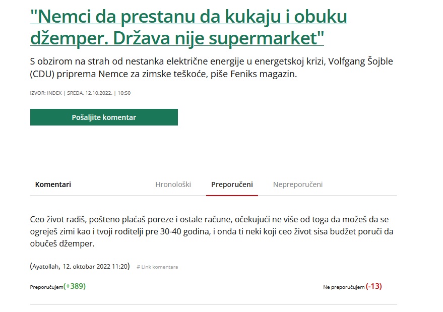 Ja nisam od sorte ljudi koja urla sve u šesnaest ''Sramota me koliko nam je dobro'' i ''Nemci nam zavide''. (to pišem samo kad sam ironičan, da bih se rugao psihijatrijskim slučajevima koji vode Srbiju). Niti imam imalo lepo mišljenje o našoj vlasti i državi, kao što se da primetiti. Ali to što su naša vlast i država debili, a sa njim i solidno parče našeg naroda koji ih bira, ne isključuje mogućnost da su i Nemci postali debili takođe.