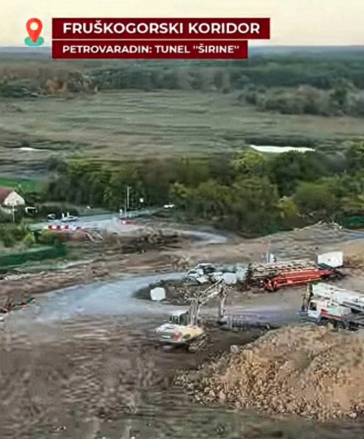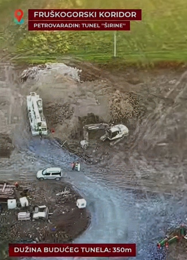 Nasut je privremeni put za odvoz materijala, koji vijuga po gradilištu. Trasa moto-puta nije ni započeta, a ona je izmedju izgradjenih mostova.Meni deluje da se nasipa kamenom iz tunela, ovo je možda bliže Rumi.