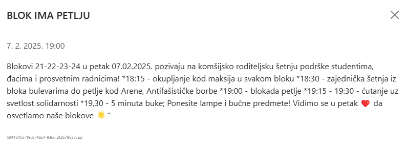 Imam dojavu da se u petak u 19 planira okupljanje i blokada kruznog kod arene u organizaciji neformalne grupe građana blokova 19a, 21, 22, 23 i 24...