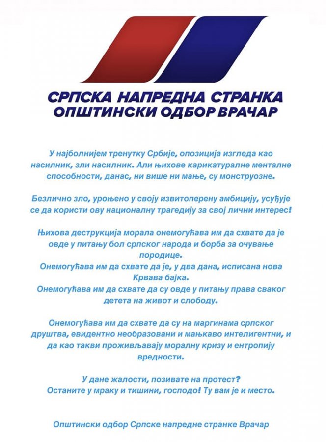 Znaš da toga neće biti. Ovo je suštinska borba da li će pobediti civlizacija ili divljaštvo. Mene stara vlast DS-a nije tukla ali jeste diskreditovala u medijima dok trenutna jeste i to više puta fizički pokušavala da zaplaši. Samo su me zainatili da ih teram dok ne slete sa vlasti. Ako ćutiš ili pametuješ tražeći savršenu opoziciju nesvesno radiš za njih. Znam da zvuči ostrašćeno ali alternativa ovom divljaštvu je daleko od savršene ali daje mogućnost da poguramo u pravom humanom smeru. Diskurs trenutne vlasti je čisto zlo koje se zasniva na nasilju i fizičkom uništavanju neprijatelja.