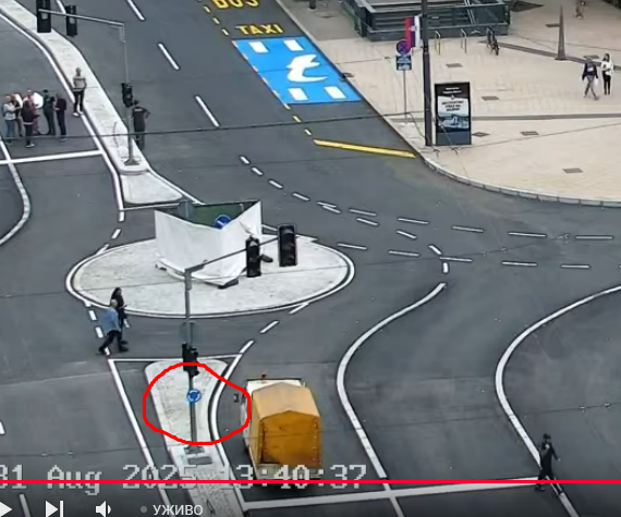 Opušteno, jantica farbe i pozdravimo se sa pola trotoara. Verivatno onim delom gde su ploče za slepe, pa će onda i co trotoar da dižu i premeštaju (pa se onda to neće lepo uklopiti i moraće opet da dižu i stave novo)Ако вози уз десну ивицу коловоза, онда само може да скрене десно ка Призренској или да настави право ка Краља Милана преко ивичњака.