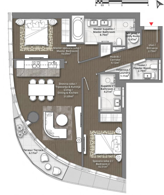 Da li misliš da će ti za ovo neko plaćati 7000 eura mesečno? Pa ovde nema mesta ni za garnituru za sedenje pune veličine (kuhinja i dnevna soba 31m2 :rolleyes:(n) a ormana ima taman dovoljno da smestim moje cipele i opremu za skijanje a gde ću sa ostatkom? Na terasu? Ova površina je za stan sa jednom spavaćom sobom...
