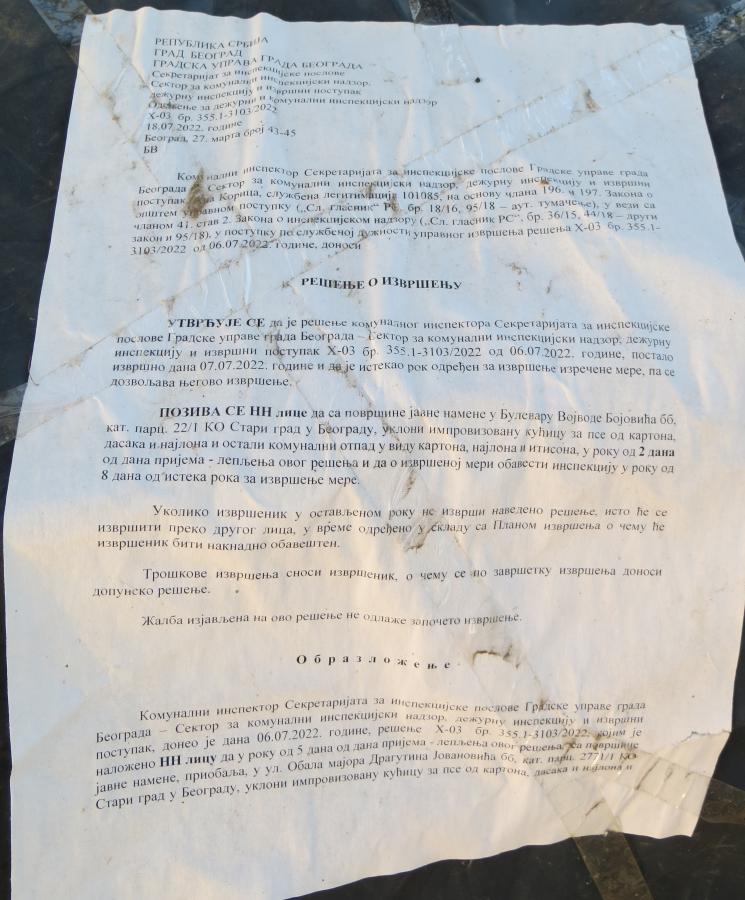 Ukratko, "Republika Srbija ... poziva NN lice da sa površine javne namene ... ukloni improvizovanu kućucu za pse od kartona, dasaka i najlona, i ostali komunalni otpad u vidu kartona, najlona i itisona u roku od dva dana o dana prijema - lepljenja ovog rešenja i da o izvršenog meri obavesti inspekciju ..." Zatim se kaže da ukoliko NN lice to ne uradi samo, snosiće troškove uklanjanja "o čemu se donosi dopunsko rešenje".