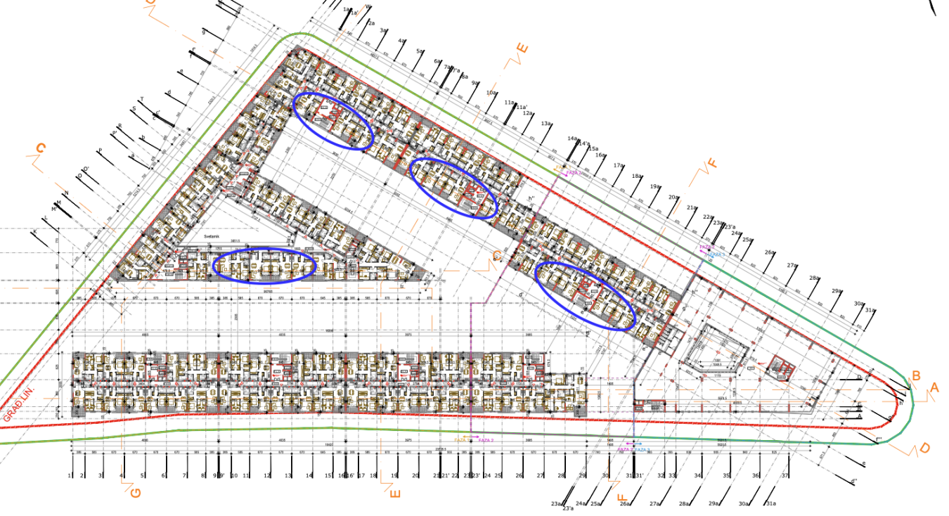 Steta sto me ovaj projekat ne zanima, ne znam gde si bio druže sa svojim analizama ranije, svaka cast!2.9 će imati i više nego dovoljno svetla, tokom leta čak i previše zbog te jugo-zapadne orijentacije. Od 50m2 najviše svetla dobijaju stanovi u lamelama C, B, A i južna strana D. Označio sam ih plavom bojom:
