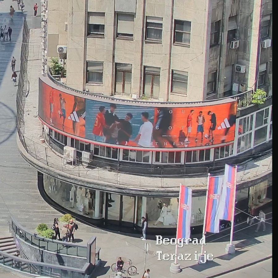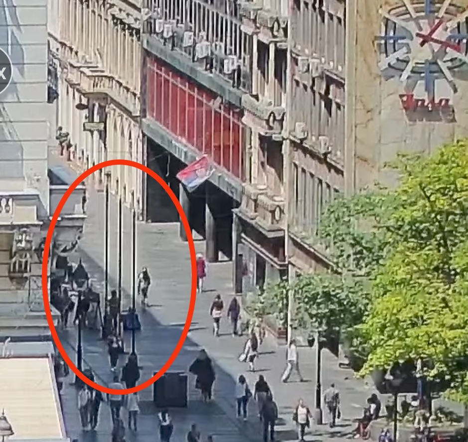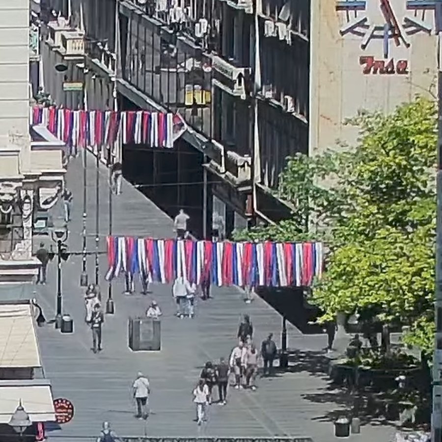 1) мобилни јарболи са српским заставама на углу Кнез Михаилове и Коларчеве;