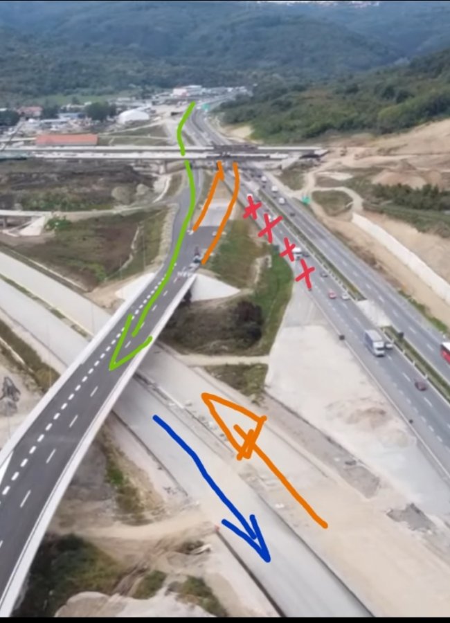 Ja mislim da je došlo vreme da se saobraćaj iz pravca Beograda ka Nišu pusti preko vijadukta pravcem ove zelene strelice koju sam nacrtao.Sve se to radi da bi mogli da završe ove delove koje sam obeležio narandžastom bojom.Crveno se ruši a plavo je već uklopljeno i asfaltirano.