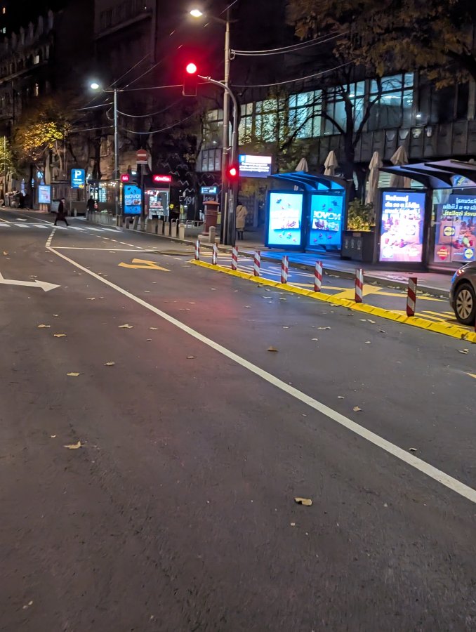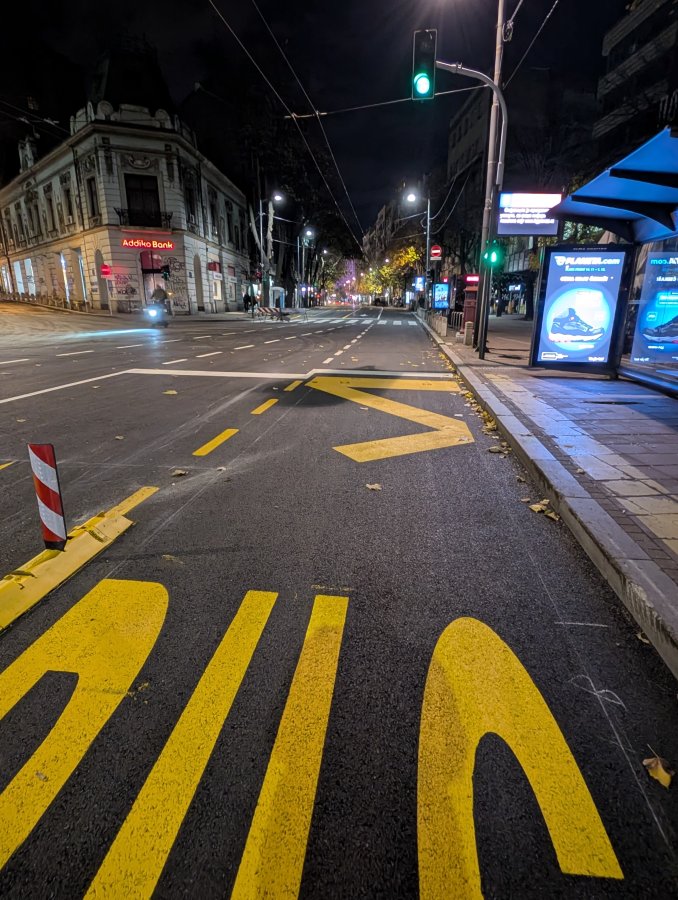 Zašto nije pomerena zaustavna linija leve trake 5m iza? Svakako tu treba samo taxi da saobraćaSituacija na terenu, govori drugačije, stavili su one idiotske barijere na stanici. Ne verujem da će 65 i 77 moći da skrenu ka Nušićevoj.