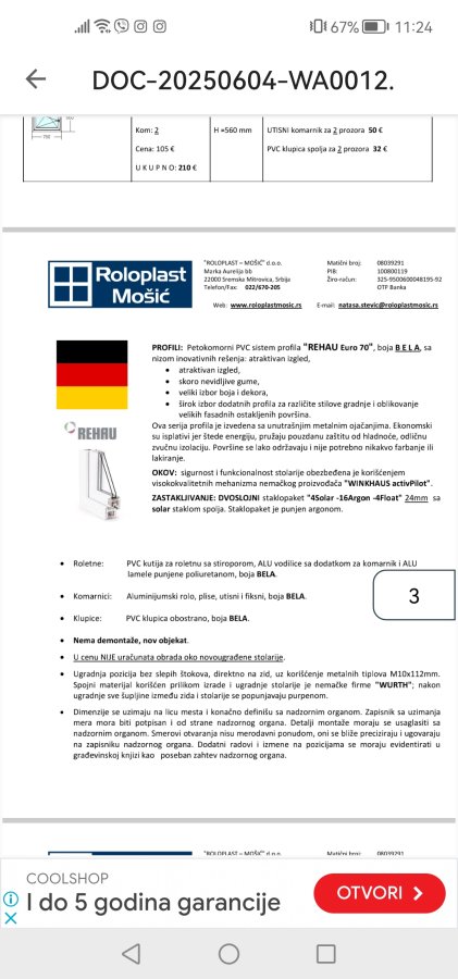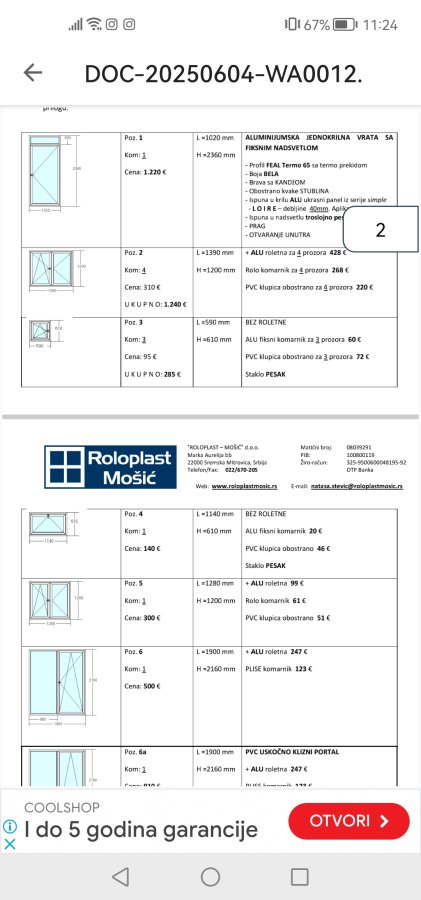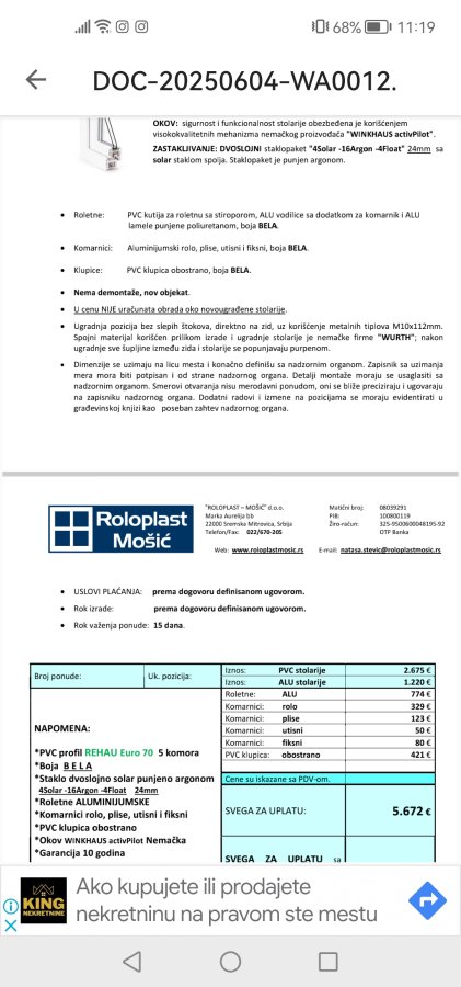 Pozdrav svima. Od firme Mosic sam dobio ponudu za kompletnu pvc stolariju na novoizgradjenoj kuci. U ponudi su alu ulazna vrata, ostalo je sve pvc, balkonska vrata su na klasično otvaranje na kvaku, gde se krilo otvara. Interesuje me iskustvo drugih ljudi sa samom ponudom i firmom. Hvala. Pogledajte prilog 240653Pogledajte prilog 240654Pogledajte prilog 240655