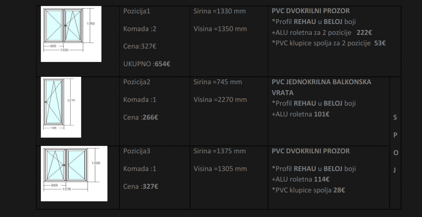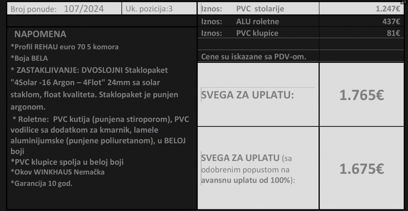 Pozdrav, nov sam na forumu. Treba da radim PVC u stanu kako bih rešio problem sa bukom (lavež komšijskih pasa, buka kamiona koji odnose smeće, vozila i slično...). Ne razumem se uopšte u PVC, od firme Roloplast Mošić sam dobio ovu ponudu pa me zanima šta mislite o njoj. Inače iz Sremske Mitrovice sam, dobio sam predlog da proverim i u firmi APC Ruma pa ću i to videti. Ako imate još neke predloge, slobodno napišite