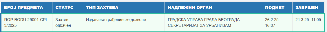 Koliko vidim na CEOP-u zahtev za izdavanje građevinske dozvole je odbijen 21.03.2025. i ne vidim nakon toga da su novi podnosili.