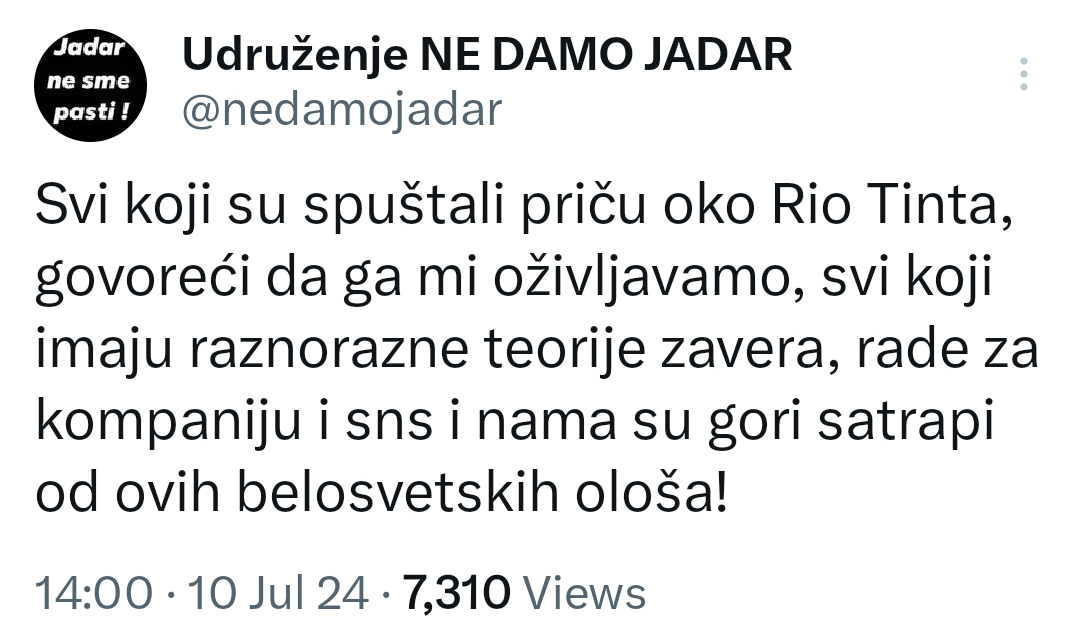 Kojih 50 rudnika?Ово са рио тинтом и 50 планираних страних рудника је једна од највећих издаја Србије и наших националних интереса, и један озбиљан ударац на суверенитет ове колоније. Сви су саизвршиоци, поготово доносиоци одлука, али и ови уцењени што ладе јаја на државном послу, и ботови и запослени у медијима који по налогу то промовишу.