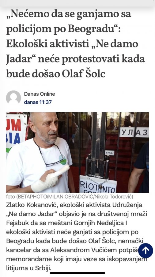 Zlatko Kokanović, ekološki aktivista Udruženja "Ne damo Jadar" objavio je na društvenoj mreži Fejsbuk da se meštani Gornjih Nedeljica I ekološki aktivisti neće ganjati sa policijom po Beogradu kada bude došao Olaf Šolc, nemački kancelar da sa Aleksandrom Vučićem potpiše memorandame koji imaju...www.danas.rs
