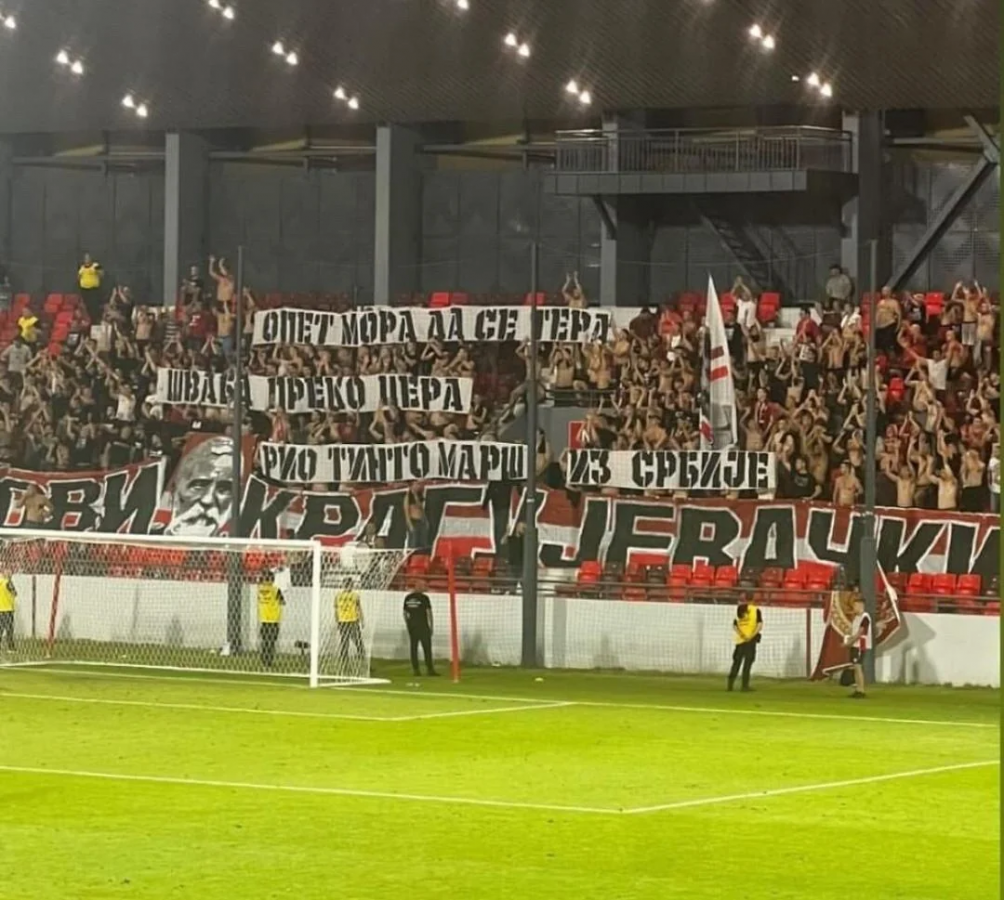 Вечерашња парола навијача Радничког из Крагујевца. (Рио Тинто, марш из Србије!)