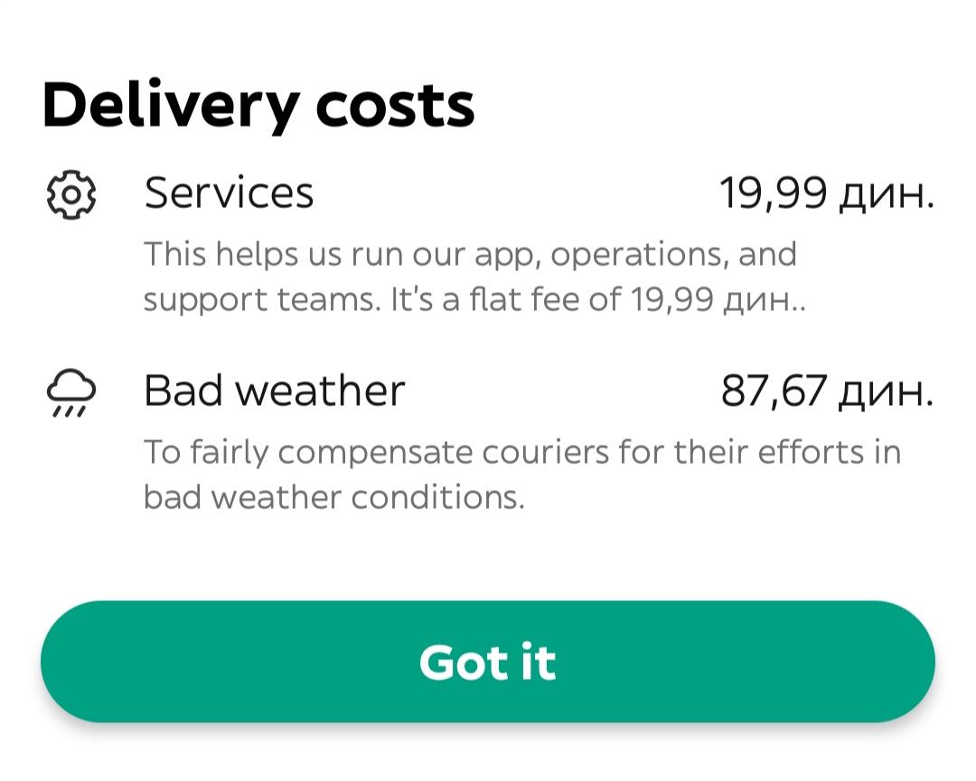 Ranije se znalo utakmica, kiša... Ponuda za ponudom, odmah prihvataš dalje... ostatak dana ugl srednja tražnja... 3, 4 sata radim, ali efektivno... Otkad su uveli nove dostavljače, utakmica, recimo mi protiv Danaca beše, ono niži nivo dostave. Imaš niži, srednji i visoki. Niži sve vreme! Na trenutak zakačilo srednji i vratilo se u niži.