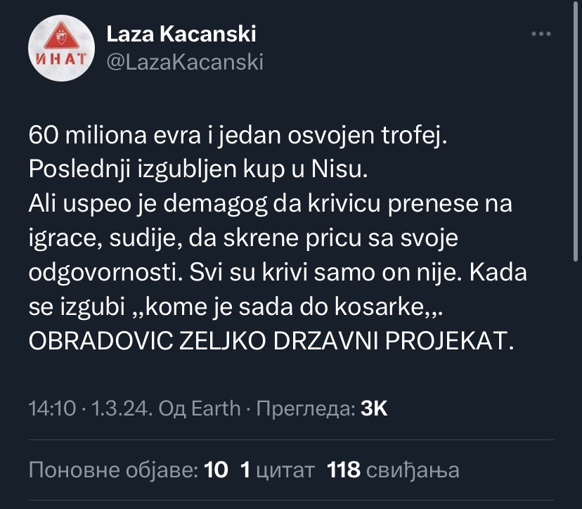 Nadam se iskreno da je ovo poslednja ovakva sezona, vreme je za nove ideje, nije ovo 2011. , a ni 2016. godina. Odnos snaga se promenio i vetar je promenio pravac. Pricalo se ovo i pred pocetak ove, pred pocetak prosle, preprosle...I pred pocetak nekoliko poslednjih sezona. Ovako kako se radilo, ne ide i ako kao zvezdaška javnost hoćemo iskorak u Evroligi, promene su potrebne. Promena politike kluba prema kriterijumima igraca pre svega. Treba nam tim, a samo skup nekih igraca nije tim. Tim je mnogo vise od toga.