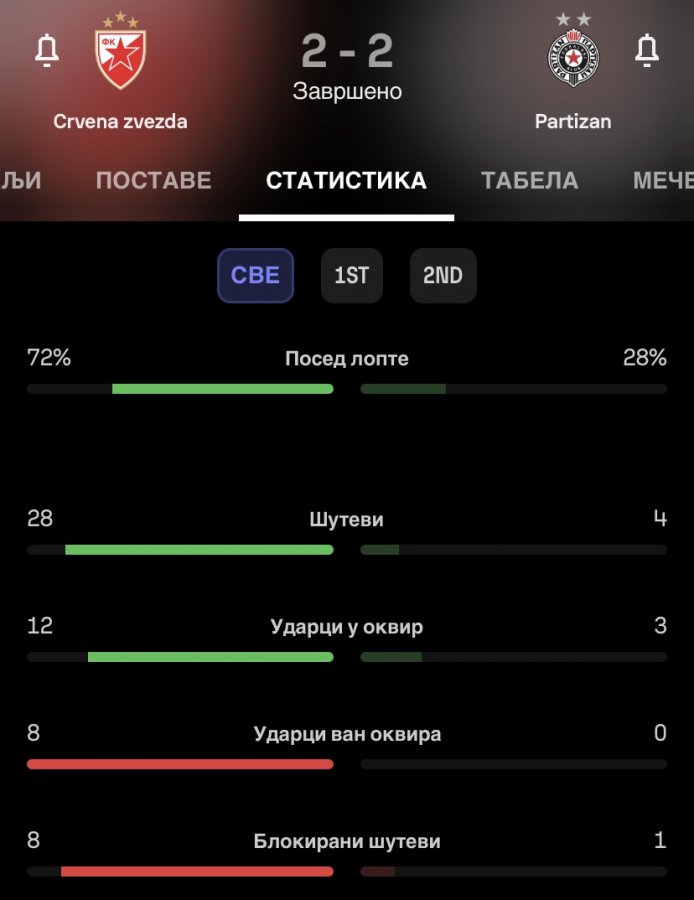 Slažem se, Zvezda je propustila bar 5-6 stopostotnih prilika, Partizan iz dva šuta dao dva gola. Ništa što se ne događa na fudbalskim terenima širom sveta. Uostalom, Zvezda je bez šuta u gol u finalu osvojila KEŠ. Nedavno je Napoli na "Rajku" imao 20 udaraca na gol Zvezde, pa nigde nisam pročitao da je trebalo biti 10:2, naprotiv, "hrabra Zvezda odolela..."
