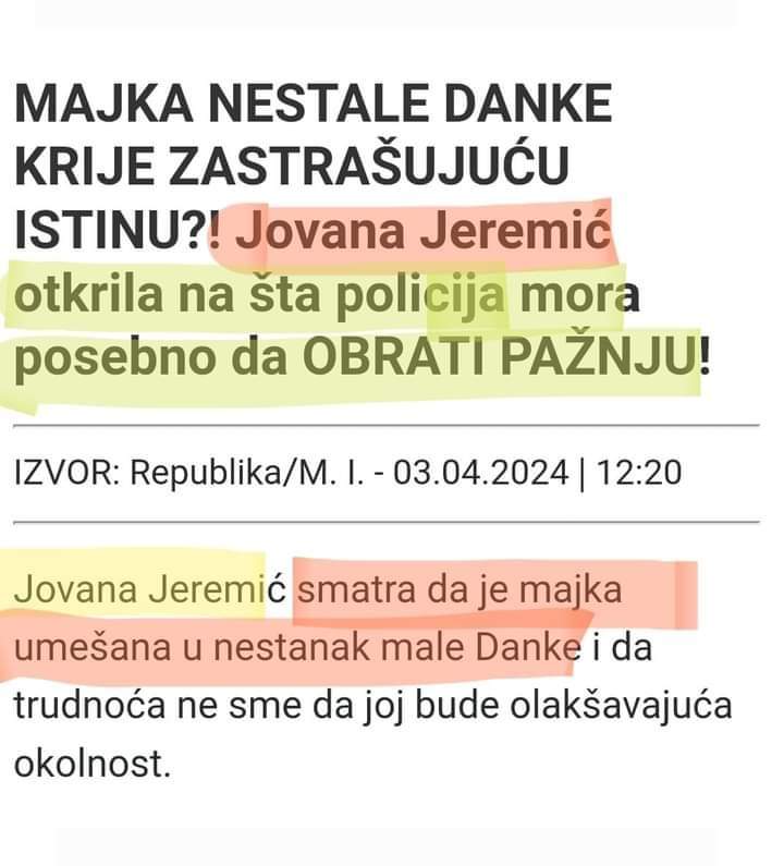 Sem da je dete nestalo, nijedna tacna informacija nije objavljena u medijima, tako da mi nije bas najjasnije koje je podatke odao ovaj policajac.evo