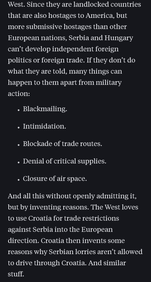 Сада ми стављаш речи у уста, нисам рекао да "Немци хоће да униште Србију" (иако су у више наврата покушали у прошлом веку) већ да се антагонистички понашају према Србији већ дужи временски период и да су се на бази тога опекли у покушају да је сломе. Стога имају сваки националистички интерес да унизе Србију, постарају се да изгуби територије као што су и они и на крају крајева, демонизују српске геополитичке циљеве који су се сукобили са њиховим у прошлом веку, како би оправдали своје.