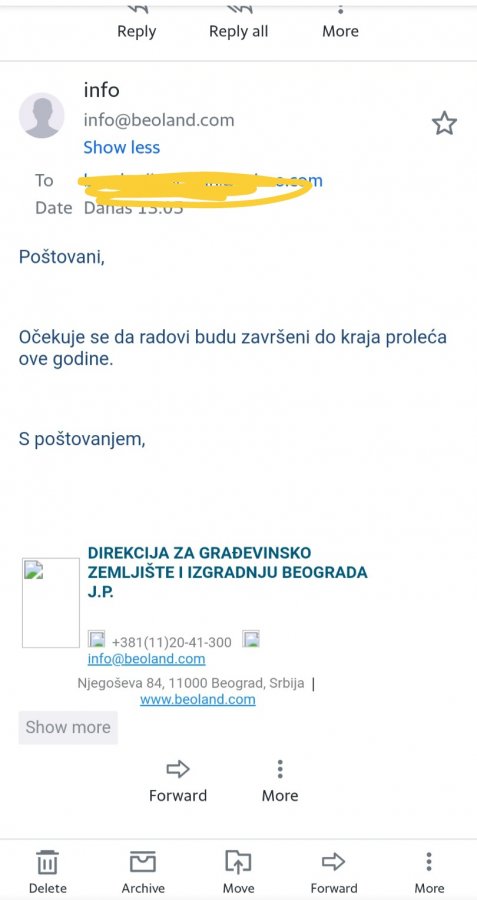 "Ocekuje se da bude zavrseno do kraja proleća". Znaci, pokrili su se vec do juna meseca, s tim sto su se ogradili i rekli da se ocekuje. Boze, Boze, koliko razlicitih informacija i koliko se ljudi frljaju sa datumima. Juce je neko na viber grupi delio informaciju od Nenada, kako ce 4 faza(kompletan Premium 1) biti useljen do kraja Juna.