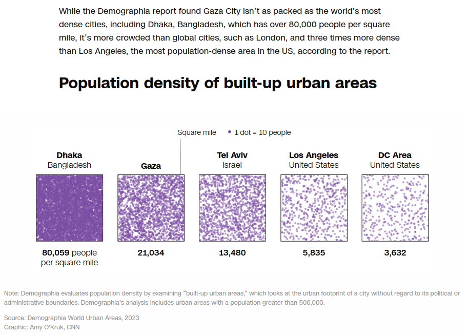 Prosečna gustina naseljenosti u Novom Beogradu, koji za razliku od Gaze ima visoke stambene zgrade, je 12.950 stanovnika po kvadratnoj milji