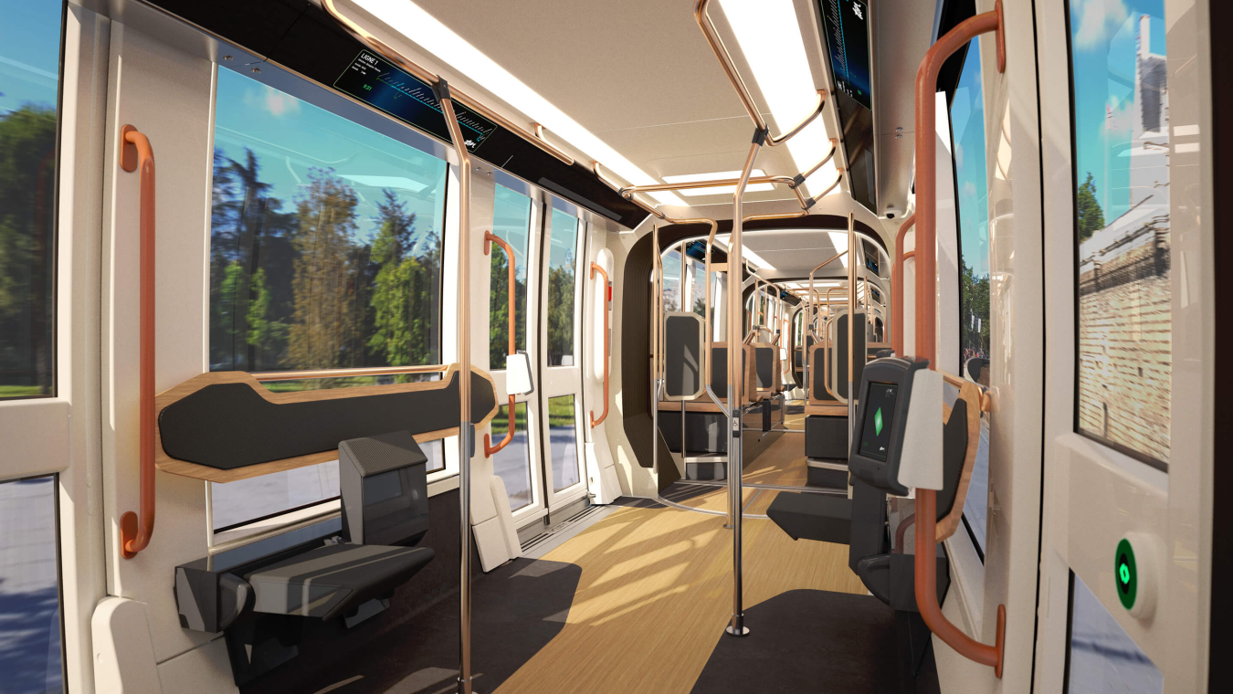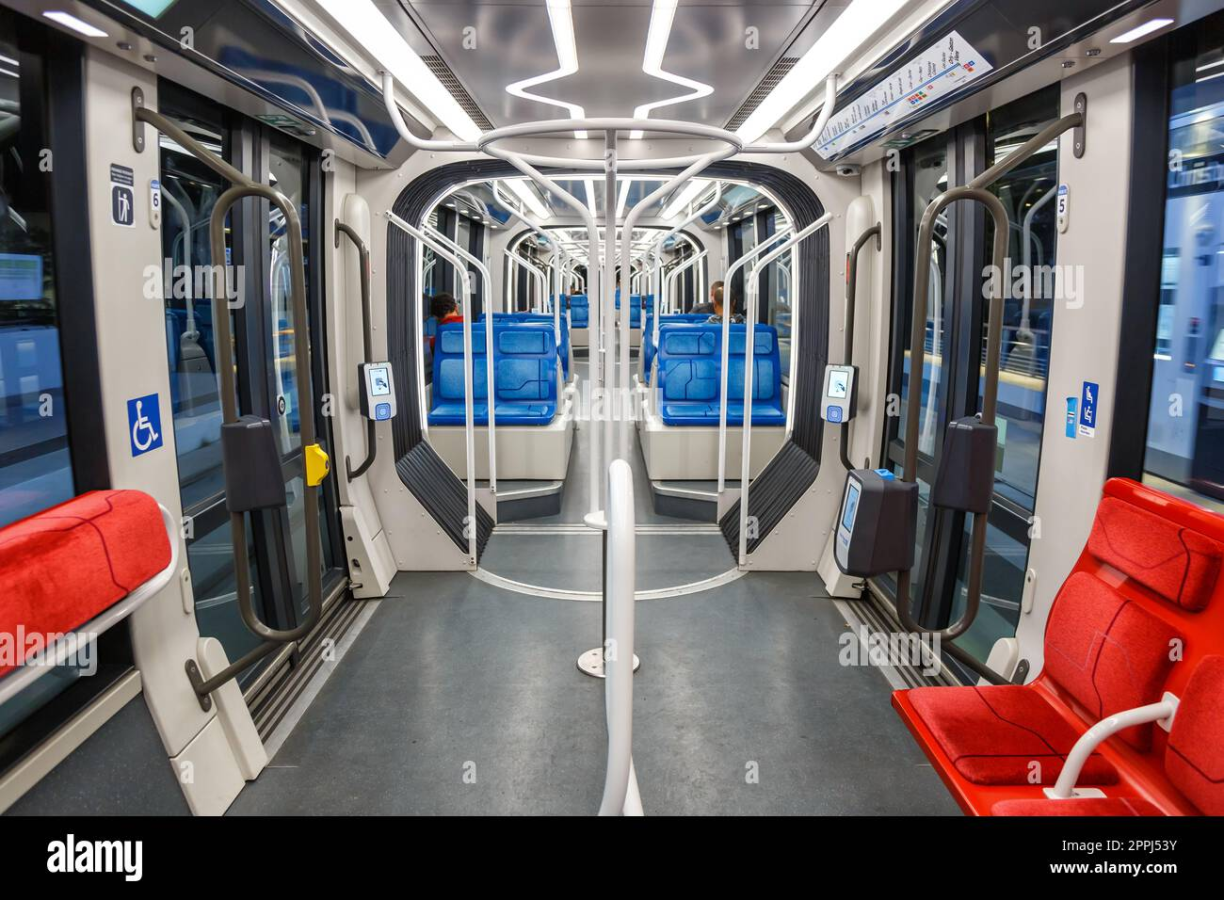 Interior of a modern Alstom Citadis X05 light rail tram on line T9 public transport transit transportation in Paris, France Stock Photo - Alamy