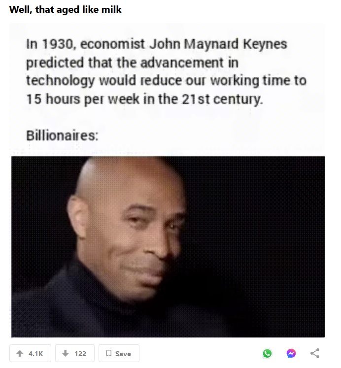 Meni je uzaludno objašnjavati bilo šta jer ja nisam na vašem nivou. Ja sam dragstor-dweller koji nema pojma ni o čemu, a pritom ne uspeva da pohvata tvoju, odnosno vašu logiku i zamisao, da će u svetu u kome populacija raste, a broj radnih mesta se smanjuje odnosno smanjivao se i pre masovnog uvođenja AI a tek sada će još više... automatizacija svega i svačega i menjanje svega robotima i mašinama kobajagi da dovede do neke utopije u kojoj ćemo svi raditi tek koliko budemo želeli, ili nećemo raditi uopšte, a živećemo od mašte i sunca i ljubavi.