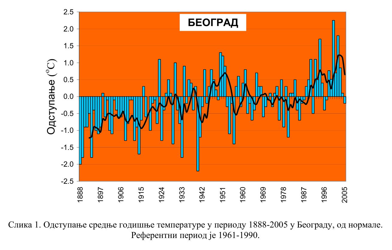 Ne znam da li smo već treći dvogodišnji izveštaj UNFCCC-u o klimi u Srbiji propustili namerno, zato što neko ne voli da se o ovome priča, ili je u pitanju prosto javašluk, ali meni ovako drastična i brza promena klime izgleda kao jedno od izrazito ozbiljnih pitanja, nešto o čemu MORA da se priča bitno više budući da ćemo na efekte svih eventualnih mera protiv klimatskih promena u Srbiji i Beogradu morati da čekamo decenijama. Nema vremena za dalje odlaganje, a bez opšteg konsenzusa da nešto ozbiljno treba menjati propustićemo trenutak kad nešto uopšte još i MOŽE da se uradi (nova urbanistička pravila, ozbiljnije pošumljavanje, javne površine određenog tipa i namene, problem izvora i vode, novi visokokapacitetni i automatski sistemi zalivanja zelenila, koridori za provetravanje grada, pokrivanje nekih ulica, nove fontane i bazeni, itd). Ne vidim da iko o tome priča. A da li stvarno razmete šta nam sve govori ova kriva ?