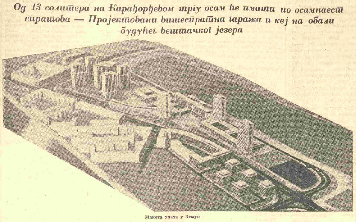 ... shvatio sam da je projekat uređenja Karađorđevog trga rađen kao kompatibilni deo šireg projekta Novog Beograda sa jezerom. Na gornjoj slici vidite uzvodnu zemljanu prevlaku preko rukavca Dunava, ka Lidu. Ideja je bila da iskopaju pola Ratnog ostrva, a da na ostatku naprave nastavak Novog Beograda, iste arhitekture i sa istim urbanističkim principima. Tako bi se Novi Beograd završavao na obali glavnog toka Dunava, a unutar njega bi bilo jezero i zona rekreacije. Tada jezero Ada Ciganlija još nije postojalo, pa je upravo ovaj deo bio zamišljen kao centralna rekreaciona zona. Svemu tome su aminovali hidrološki stručnjaci zbog pogrešne analize da će bez zatvaranja desni rukavac Dunava biti zatrpan. To se naravno nije desilo. Dunav je ponovo nanosio pesak na ono što iskopaju u zoni Ratnog ostrva, a dok je nivo dna u desnom rukavcu ostao stabilan. Tako je ova užasna i ekološki destruktivna ideja napuštena, ali nažalost ne pre nego što je soliterima trajno upropaštena vizura Zemuna. A za to su krivi arhitekti i urbanisti, a ne vojska. Vojska je samo bila jedina koja je odmah imala para, pa je samo zato ovaj posebni deo šireg, okvirnog projekata Novog Beograda sa jezerom, odmah mogao da počne sa izgradnjom. Iz novog snimka iz istog ugla vidite da je skoro sve na Karađorđevom trgu izgrađeno baš u skladu sa maketom koja pretpostavlja da je Karađorđev trg ustvari deo takve verzije Novog Beograda, dakle njegova obala budućeg jezera na strani ka Zemunu, od koga je odvojena dugačkim horizontalnim zgradama-bedemima i soliterima (vidi članak). Slika je takođe iz Voždove poruke.